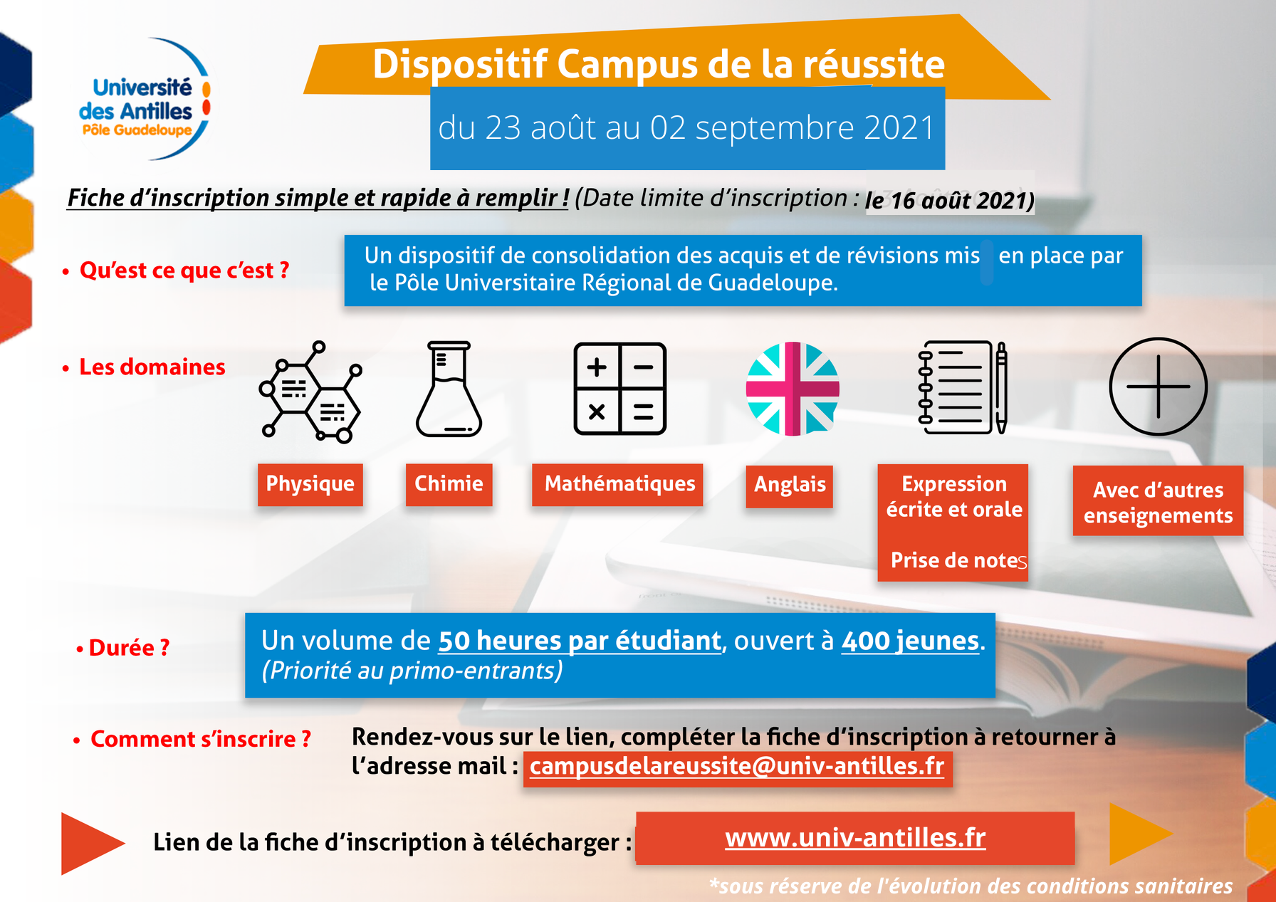Mise en place du dispositif « Campus de la réussite » du 23 août au 02 septembre 2021, de 08h à 13h au sein des 3 campus du pôle Guadeloupe de l’université des Antilles (campus de Fouillole, campus du Camp Jacob et campus du Morne Ferret).